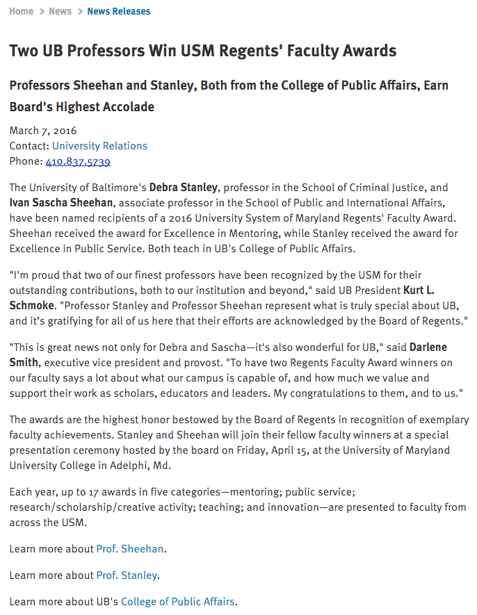 Phone: 410.837.5739The University of Baltimore’s Debra Stanley, professor in the School of Criminal Justice, and Ivan Sascha Sheehan, associate professor in the School of Public and International Affairs, have been named recipients of a 2016 University System of Maryland Regents’ Faculty Award. Sheehan received the award for Excellence in Mentoring, while Stanley received the award for Excellence in Public Service. Both teach in UB’s College of Public Affairs.