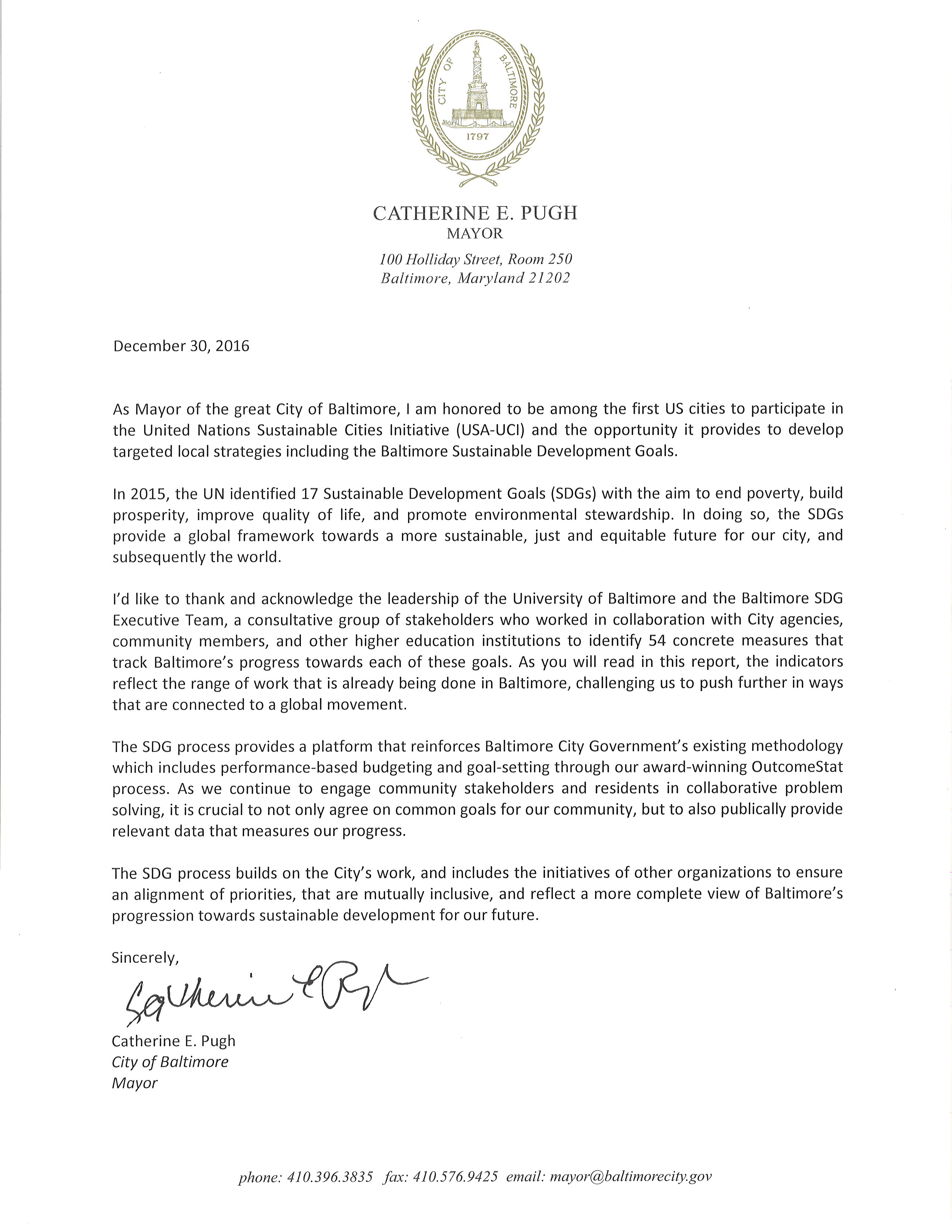 A new 84 page report released by the University of Baltimore articulates how the United Nation’s Sustainable Development Goals (SDGs) can be localized to support a more sustainable Baltimore. Mayor Catherine Pugh endorsed the initiative when she took office in December 2016. “As you will read in this report, the indicators reflect the range of work that is already being done in Baltimore, challenge us to push further, and connect us to a global effort,” said Mayor Pugh in the report’s foreword. “Every urban university has a special responsibility to support and advance the communities in which it resides,” said Kurt L. Schmoke, president of the University of Baltimore. “At UB, we are sharing our expertise in the growing field of sustainability, serving as a gathering place for information, trends and planning efforts. In time, this hard work will help to deliver a Baltimore that is more livable, equitable and, most importantly, a city that thrives in the 21st century.” A link to the full report, which includes ways to get involved and details about each of the Baltimore SDGs, is available on UB’s Sustainable Cities Initiative website.
