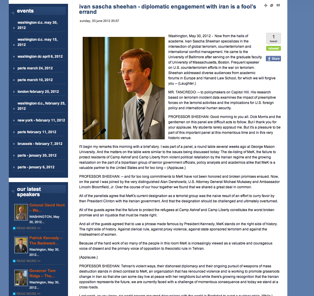 […] Dr. Ivan Sascha Sheehan will participate in an off the record roundtable discussion with Ambassador Lincoln P. Bloomfield, Jr. at a prominent Washington think-tank on June 13 to examine findings from a new study entitled The Mujahedin-e Khalq (MEK): Shackled by a Twisted History. The discussion will include a small group of former government officials and Iran experts who will look at how information and intelligence about the Iranian opposition group led to assumptions and judgments that may have constrained policy formulation over time. The roundtable will also address how evolving policy doctrines on terrorism and human rights affect the case and the options available to policymakers in the aftermath of the elections. […]