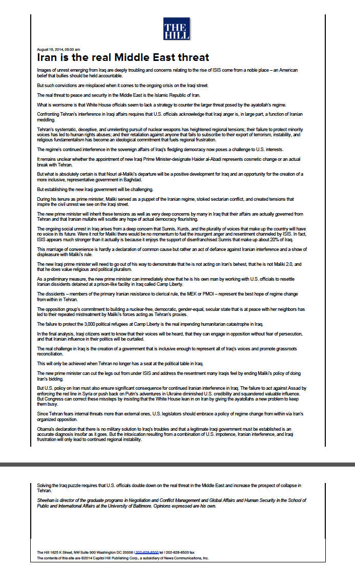 […] Dr. Ivan Sascha Sheehan in the Diplomatic Courier on the September 1 assault on Iranian dissidents at Camp Ashraf and the need to protect the Iranian opposition. […]