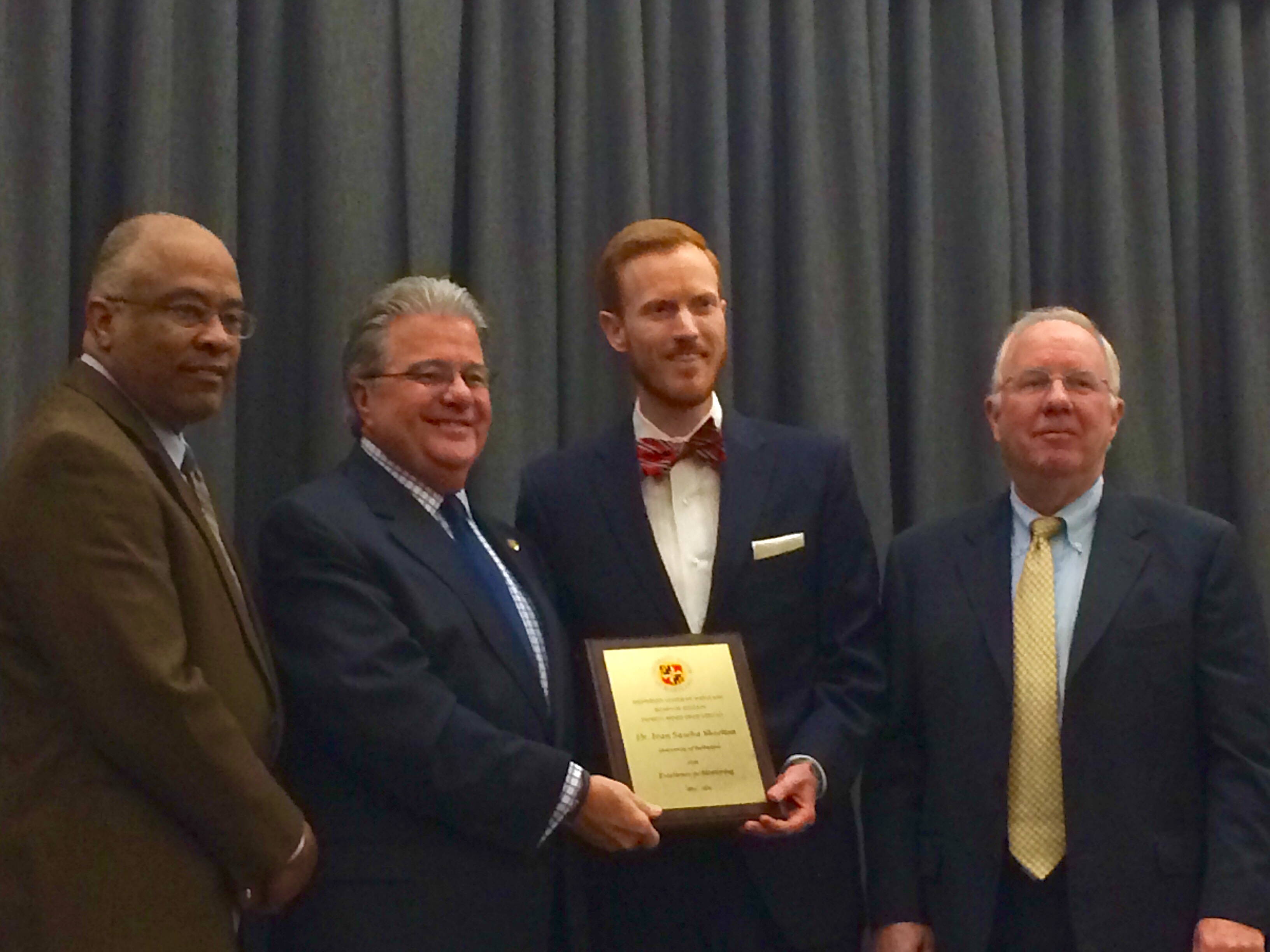 L to R: University of Baltimore President and Fmr. Mayor of Baltimore City, Kurt L. Schmoke; Chancellor of the University of Maryland System, Robert L. Caret; Ivan Sascha Sheehan; Chairman of the University of Maryland Board of Regents, James L. Shea